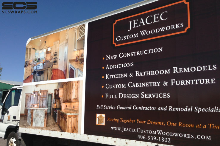 Jeacec Custom Woodworks, based in Churchill, MT, does custom woodwork ranging from full re-models to individual furniture pieces. They are expanding their service fleet that includes this recently wrapped, giant box truck. This vehicle is literally a moving billboard always working for them. The information and photos that are on it are sure to communicate this company’s extensive services and capabilities to everyone that sees it. It was a pleasure working with them as they take great passion in their business. Check out the photos below of this large box truck wrap. Look for this vehicle, along with many others, all over the Gallatin Valley. If you would like to discuss a vehicle wrap for your business, please do not hesitate to contact SCS Wraps today! [email protected] or 406-585-2635.