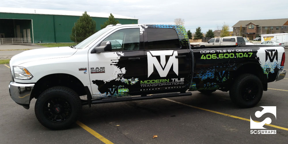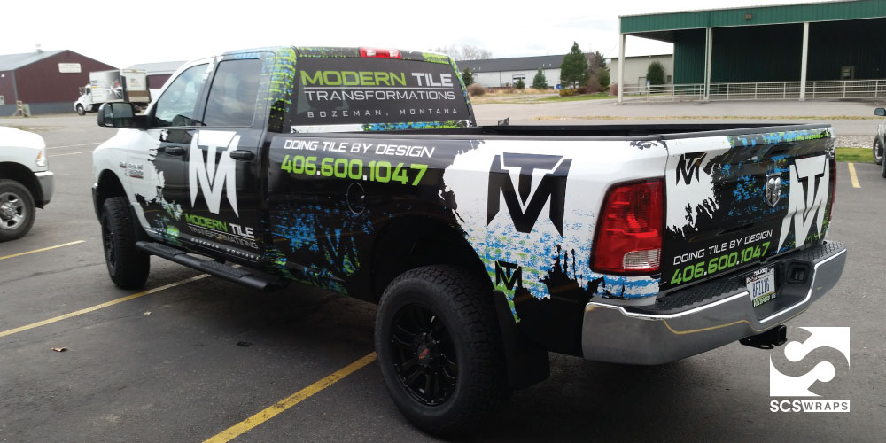 Modern Tile Transformations, based in Bozeman, MT is working on building an amazing business. Â Their first step toward aggressively marketing the company was a vehicle wrap on his Dodge pickup truck. Â The idea behind the design was to have his truck truly stand out from the crowd and not be of the norm. Â He was looking for a design that matched up with his excitement for starting his business. Â The end result and product is something that we are truly proud of and MTT could not have been more pleased. Â Please take a look at the photos below.