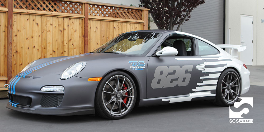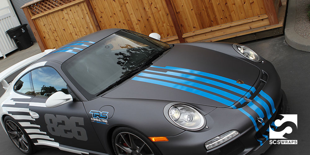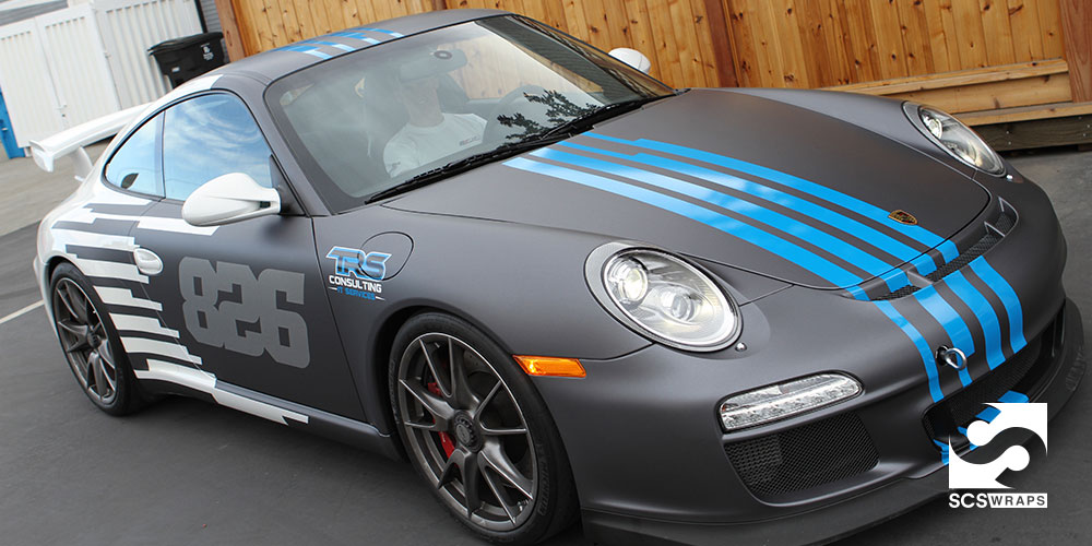 Tim Salveson, the owner of TRS Consulting in Redwood City, California contacted SCS Wraps to create a new look for his Porsche GT3 and protect it at the same time. Track days can be tough on the cars paint and he wanted to protect it from the flying rubber and other debris on the track. Using 3M 1080 Dark Gray as a base layer and 3M ij180cv3 unlimited blue overlays we created a unique one off GT3 that Tim has always wanted.