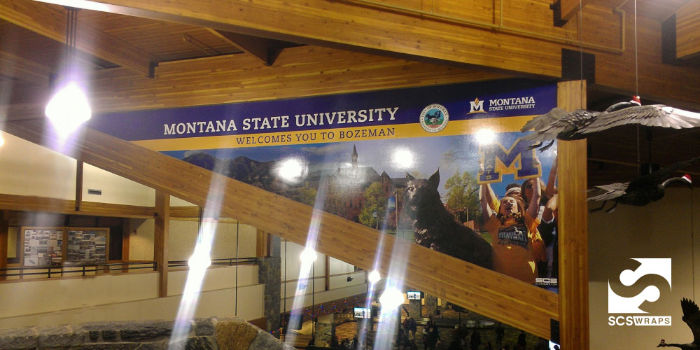 We are slowly, but surely wrapping Montana State University :)! This recent project was just completed at the North Hedges Residence Hall. There is a large conference room in the dorm's lobby where they have regular meetings, and welcome incoming freshman to MSU. The back wall of this conference room was blank, as you can…