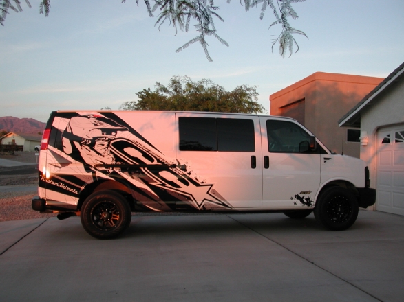 Recently, we got a call from Glenn Cowan out of Lake Havasu City, AZ and he inquired about wrapping his van with a similar design like we did for our Freestyle Motocross athlete Keith Sayers. We started with the existing design of Keith’s and added a few tweaks based on Glenn’s recommendations and ideas. The final wrap product came out great and he had it installed in his hometown. We thank him greatly for the business and photos.