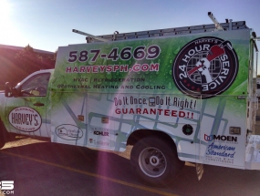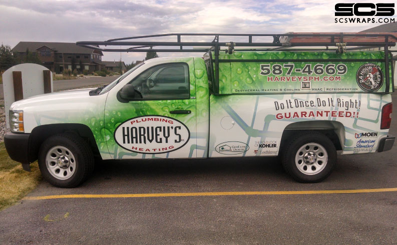 Harvey’s Plumbing and Heating are your local experts when it comes to all things plumbing and heating. They are doing amazing things with regard to the advancement of green energy solutions and have an incredibly experienced staff to stand behind their work. Harvey’s has been around the Gallatin Valley since the mid-1970’s and their vehicle fleet is growing and growing. SCS Wraps has worked with them on various projects over the years but they recently decided to step up their impact advertising by starting the first phase of wrapping their entire vehicle fleet. This first truck was just completed by our team and what a transformation this was! To go from a single logo decal on the doors of an all white truck with custom box to a full coverage vehicle wrap is amazing. This truck has a twin that we will be completing in the coming weeks along with a third truck to round out this initial phase.