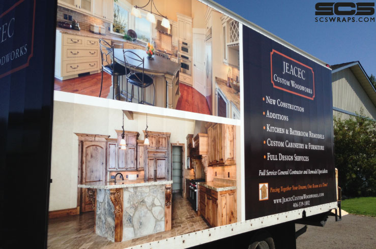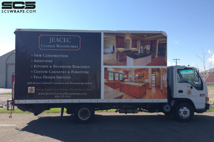 Jeacec Custom Woodworks, based in Churchill, MT, does custom woodwork ranging from full re-models to individual furniture pieces. They are expanding their service fleet that includes this recently wrapped, giant box truck. This vehicle is literally a moving billboard always working for them. The information and photos that are on it are sure to communicate this company’s extensive services and capabilities to everyone that sees it. It was a pleasure working with them as they take great passion in their business. Check out the photos below of this large box truck wrap. Look for this vehicle, along with many others, all over the Gallatin Valley. If you would like to discuss a vehicle wrap for your business, please do not hesitate to contact SCS Wraps today! [email protected] or 406-585-2635.