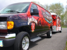 Recently Jim Beam and The Clintons Band of Bozeman, Montana teamed up to promote themselves with a full van and trailer wrap. When it came down printing and application, SCS was contacted to get the job done. This vehicle wrap is truly an eye catching piece so we ensure you will not have to look far to see it touring a city near you!
